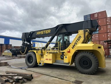 101,000lbs Capacity 1st Row 5-High, Elme 20-40 ISO Container Spreader w/4 lifting eyes, Powered Pile Slope, Cummins QSX12 Tier 4 Final Diesel - 558 Hours, Spicer TE30 Powershift Transmission, 18:00 x 33 Drive & Steer Tires, Sliding Fully Enclosed Operators Cab with A/C, Heat, and Joystick Controls