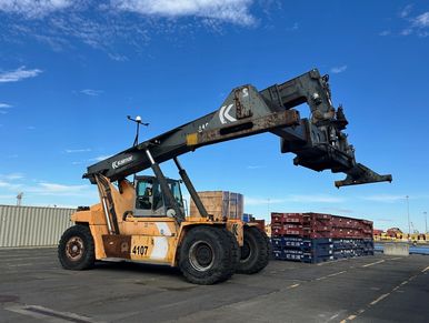 Off Lease Fleet Inventory well maintained by customer. 5-high loaded containers and a 99,000lb capacity in the first row. Featuring a Kalmar ISO 20-40 spreader and a Cummins Tier III diesel engine. Sliding cab with heat, A/C, and wipers.
