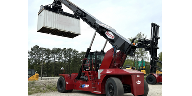 NEW INVENTORY: 5-High Loaded Containers, featuring a 99,000lb capacity in the first row. This equipment includes a Kalmar ISO 20-40 Spreader and a VOLVO 12.8L TAD1181 T4 Final Diesel engine with only 25 hours of use. It comes with a Sliding Cab equipped with Heat, A/C, and Wipers, making it ideal for handling containers and other large capacity forklifts.